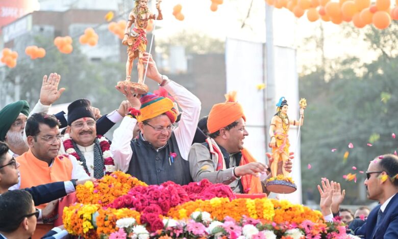 इससे पूर्व माननीय मुख्यमंत्री श्री धामी ने त्रिशूल चौक का लोकार्पण किया उससे पूर्व उन्होंने कांवरियों की पैर पखारे एवं उनको अंगवस्त्र व पुष्प माला भेंट कर उनका अभिवादन किया, इसके उपरांत त्रिशूल चौक से सरस मेला कार्यक्रम स्थल गांधी पार्क तक आयोजित शिव बारात में प्रतिभाग किया। शिव बारात में माननीय मुख्यमंत्री का विभिन्न संगठनों व जनता द्वारा फूलमाला,पुष्पवर्षा कर भव्य स्वागत किया।