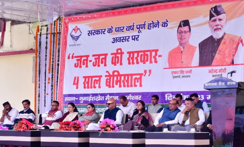धामी सरकार के चार वर्ष पूर्ण होने के उपलक्ष्य में सोमवार को प्रदेश भर में “जन-जन की सरकार चार साल बेमिसाल” कार्यक्रम धूमधाम से मनाया गया। देहरादून से मुख्यमंत्री पुष्कर सिंह धामी के भाषण का लाइव प्रसारण किया गया। सूचना एवं लोक संपर्क विभाग द्वारा प्रकाशित विकास पुस्तिका “संकल्प से सिद्धि: विकसित उत्तराखंड, बेमिसाल विकास और नई पहल के चार वर्ष” का विमोचन किया गया। विभिन्न विभागों ने अपने स्टॉल लगाकर पात्र लाभार्थियों को जनकल्याणकारी योजनाओं से लाभान्वित किया गया।